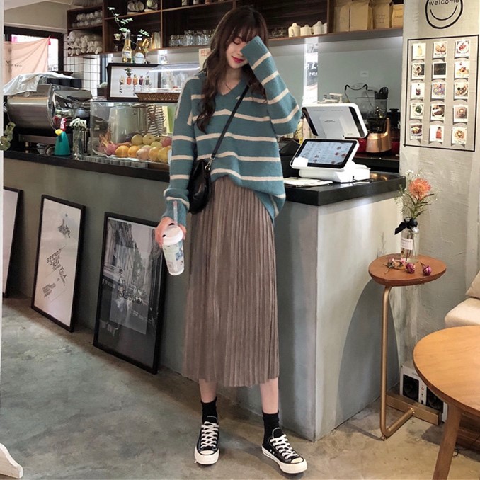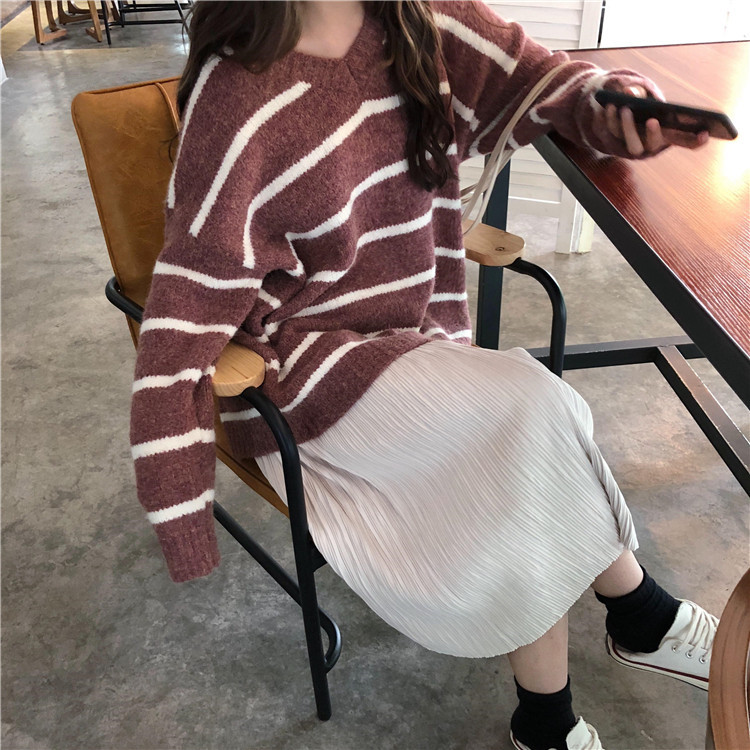 / 韓版時尚休閑套裝秋季女裝V領條紋針織毛衣外套+百褶半身裙兩件套