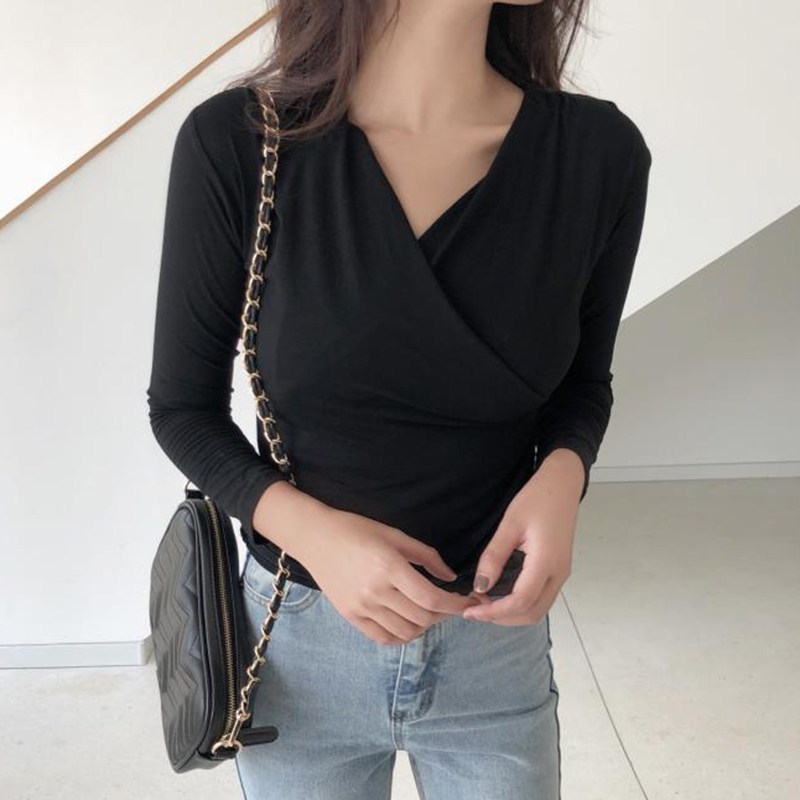 長袖打底衫早秋新款女裝復古氣質V領緊身上衣時尚百搭黑色顯瘦T恤
