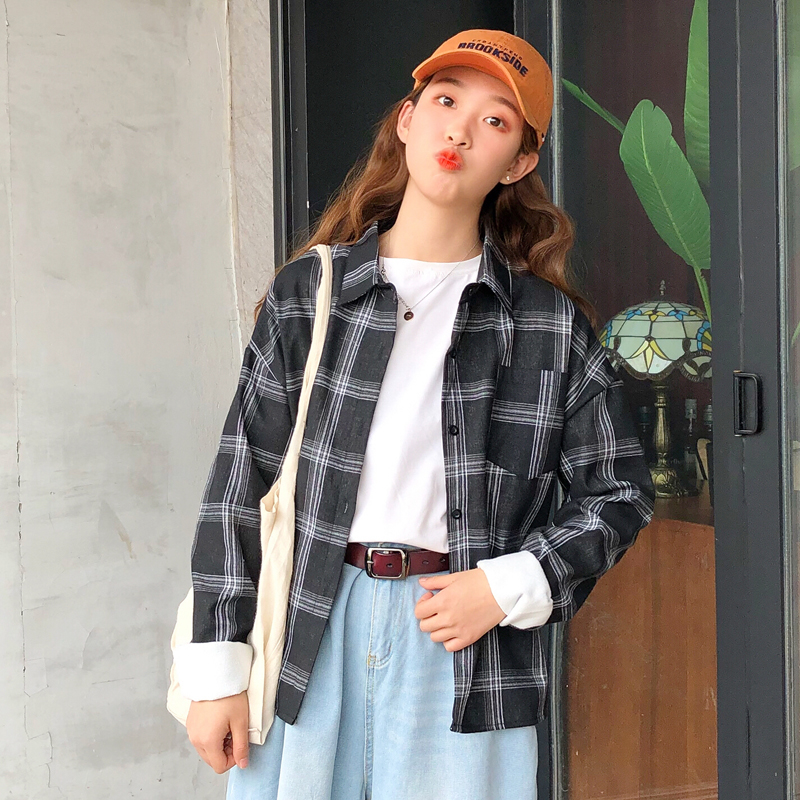 / 開衫女秋冬裝2018新款寬松加絨加厚格子長袖POLO襯衫學生休閑外套