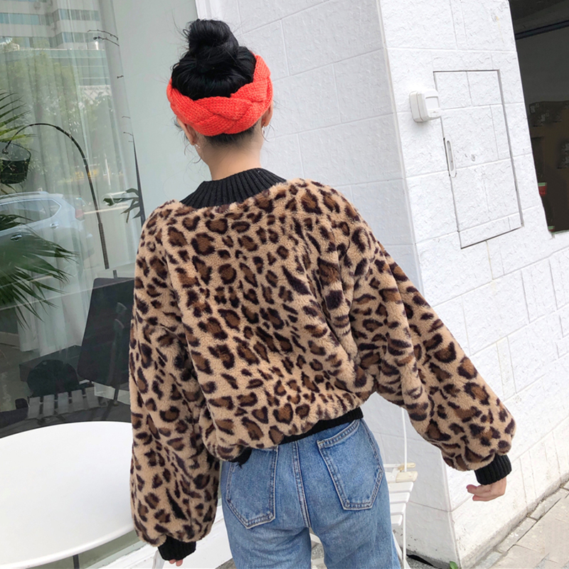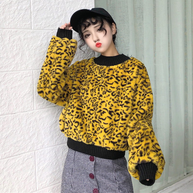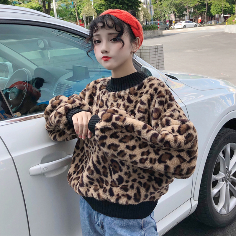 復古豹紋毛絨衛衣秋冬女裝新款寬松燈籠長袖外套圓領休閑短款上衣