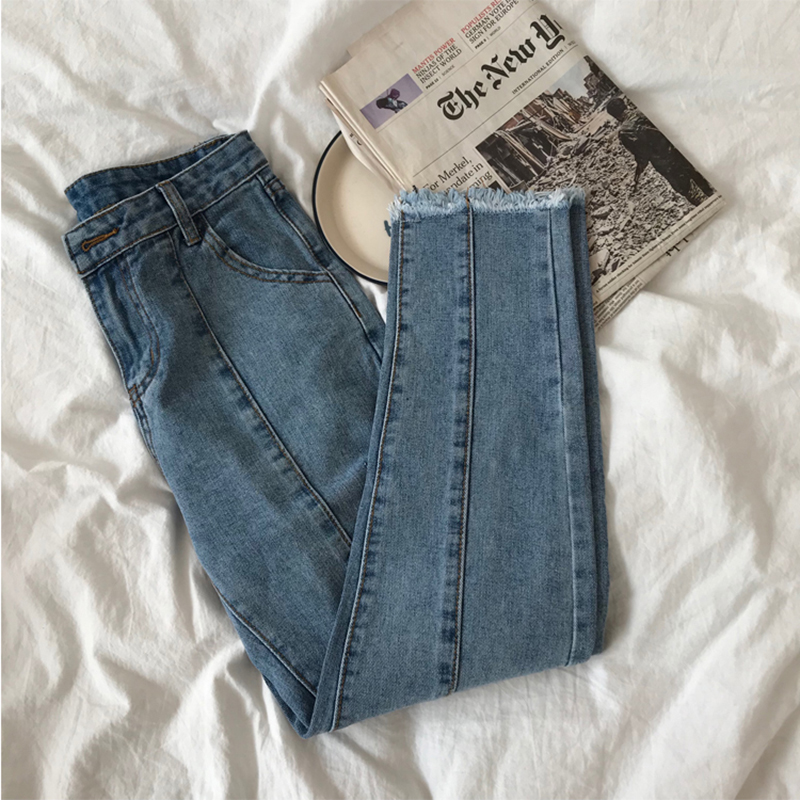 休閑毛邊牛仔褲女2018秋裝新款韓版修身高腰直筒褲子學生九分褲潮
