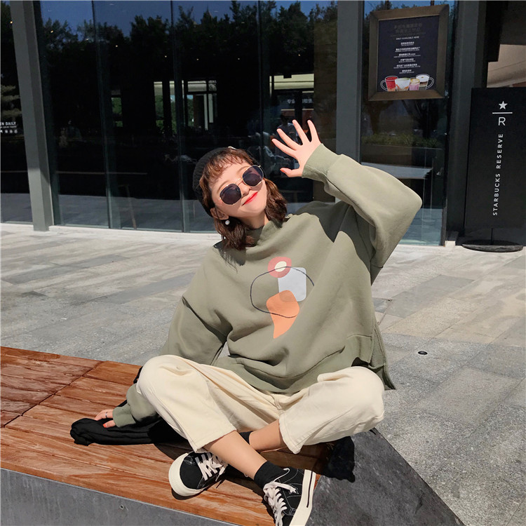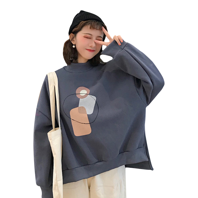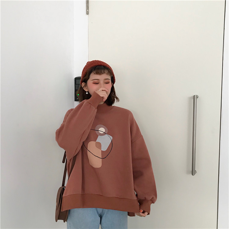 2018新款秋冬韓版復古寬松抽象圖案半高領套頭衛衣上衣外套學生女