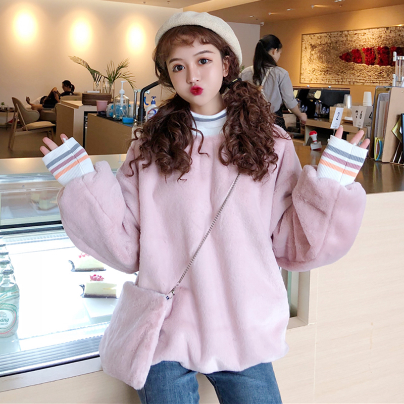 秋冬上衣女新款半高領寬松加絨保暖外套套頭長袖毛絨衛衣+小包包
