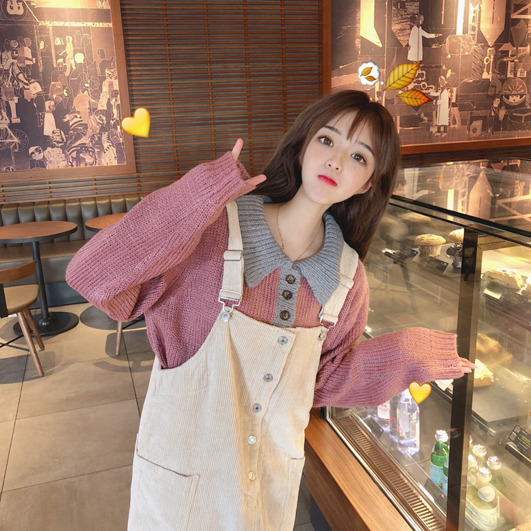 / 韓版時尚休閑套裝秋季撞色POLO領針織毛衣+燈芯絨背帶裙兩件套女