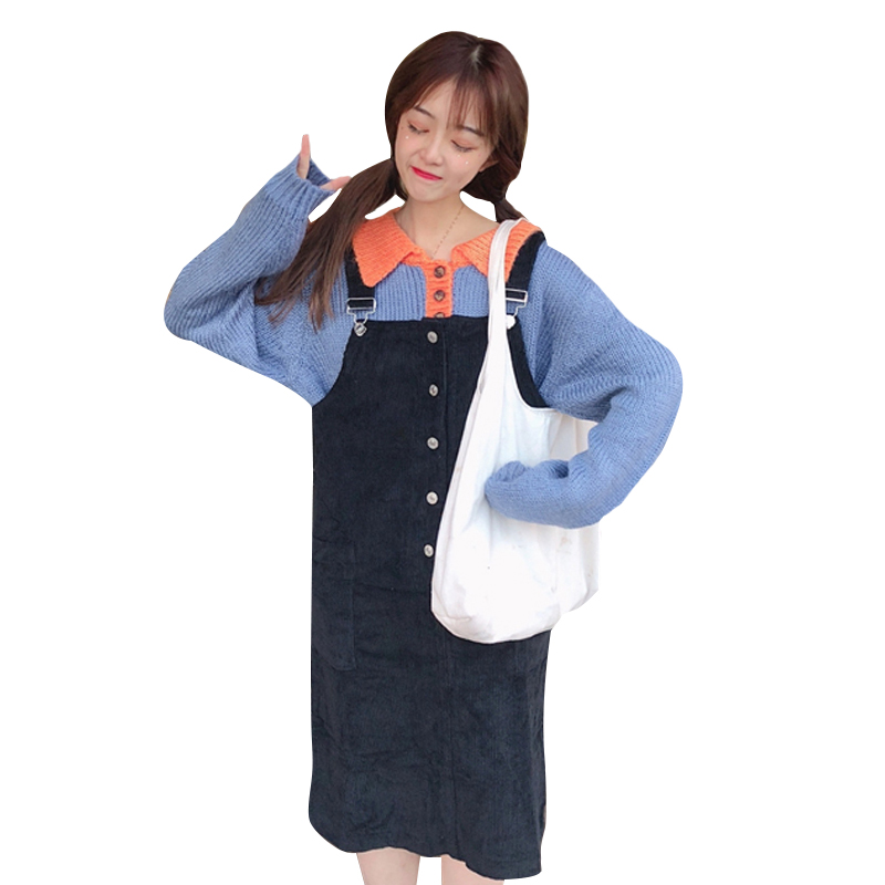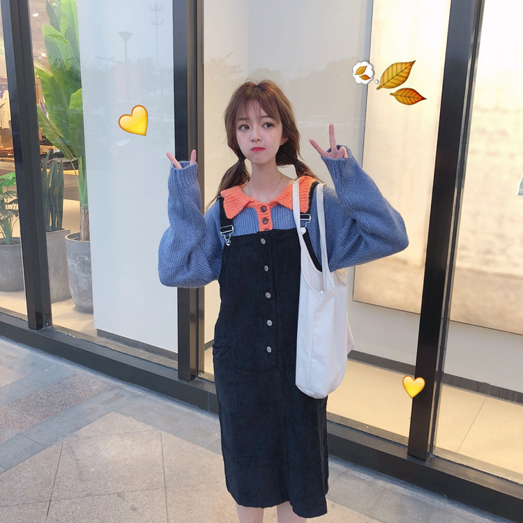 韓版時尚休閑套裝秋季撞色POLO領針織毛衣+燈芯絨背帶裙兩件套女