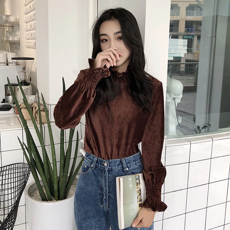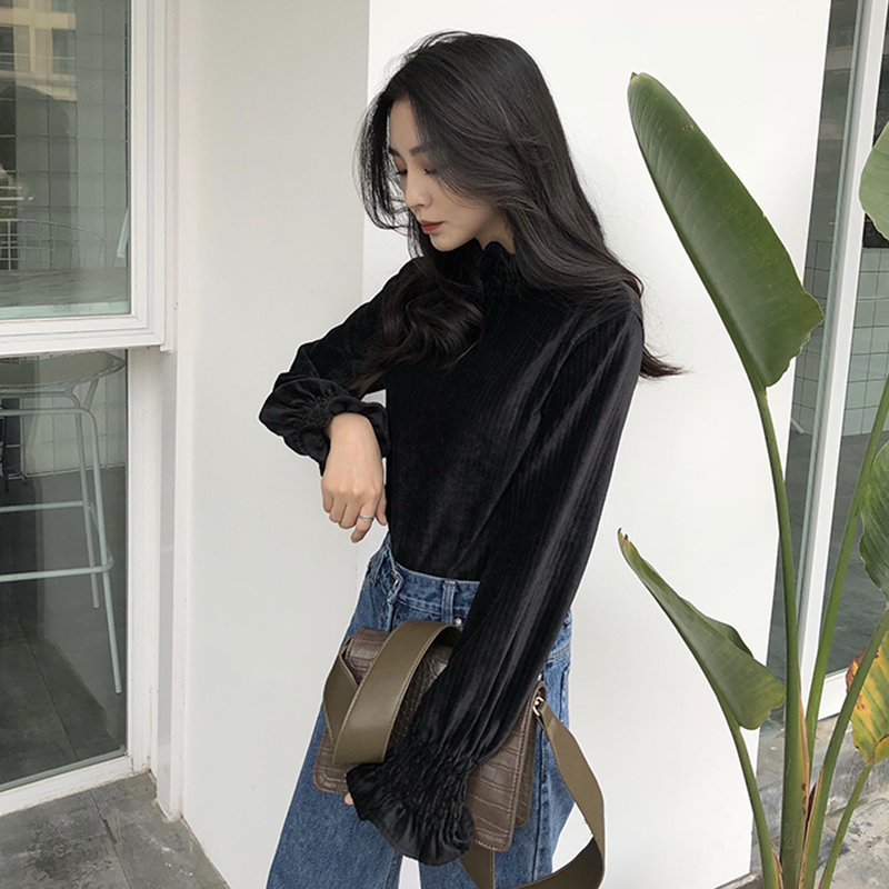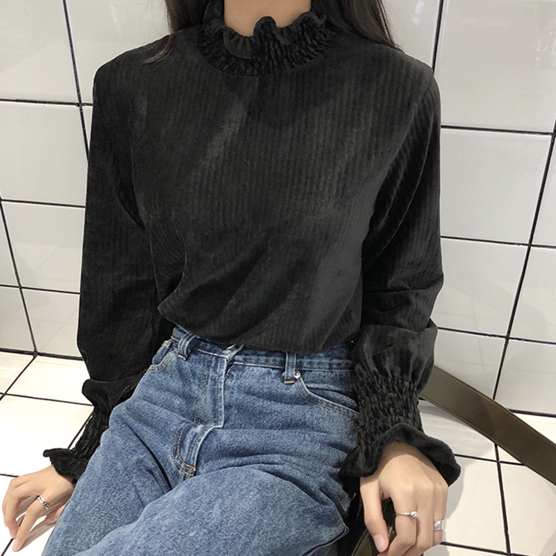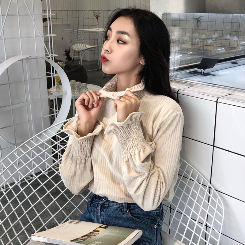/ 洋氣木耳邊半高領T恤秋季2018新款女裝港味復古荷葉長袖打底上衣