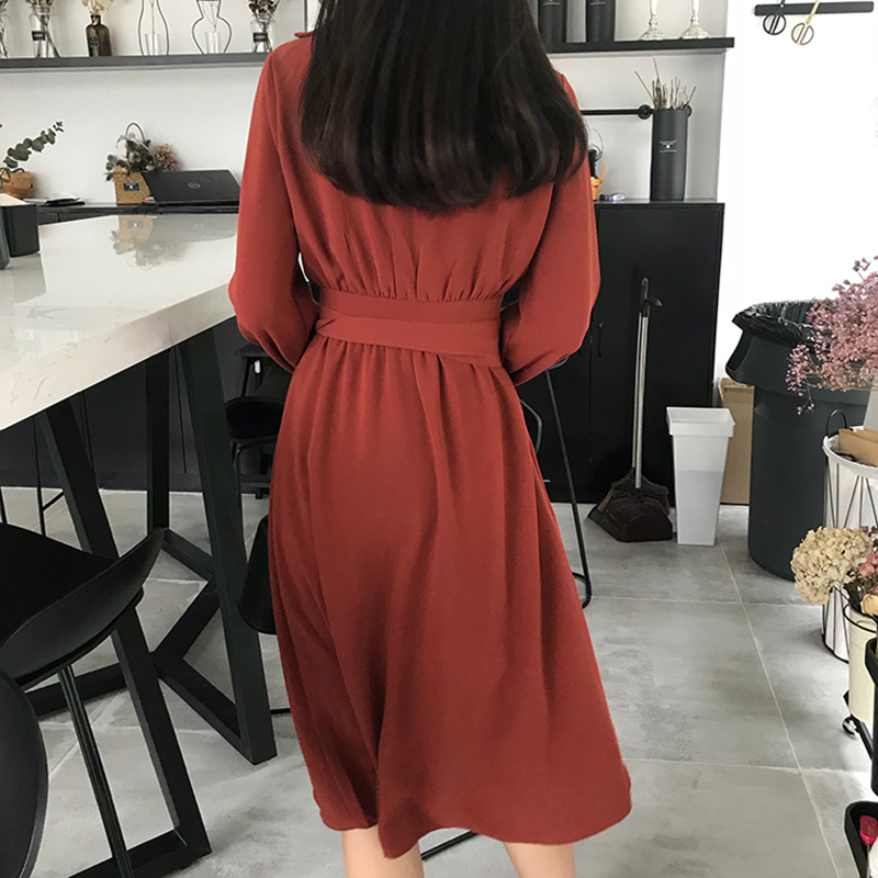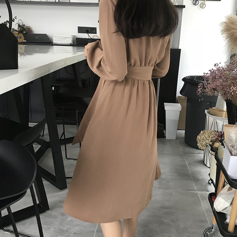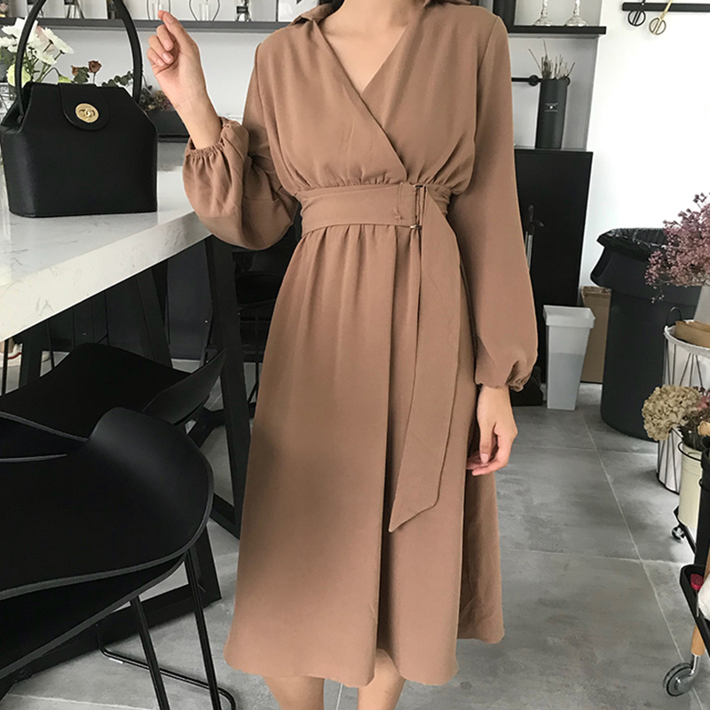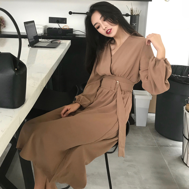 秋裝女2018新款復古氣質收腰綁帶連衣裙時尚V領泡泡袖a字中長裙子