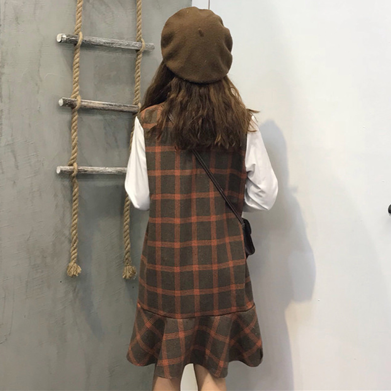 學院風中長裙秋裝女新款韓版學生蝴蝶結格子連衣裙假兩件荷葉裙子