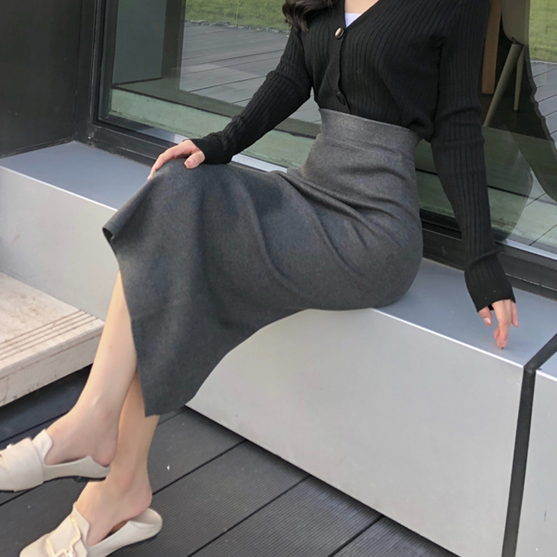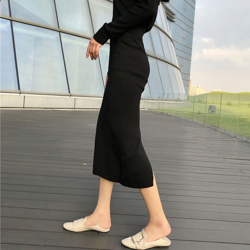 / 復古高腰開叉修身針織半身裙秋裝女2018新款氣質中長a字包臀裙子