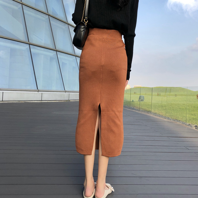 復古高腰開叉修身針織半身裙秋裝女2018新款氣質中長a字包臀裙子