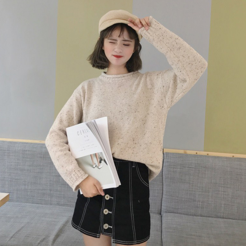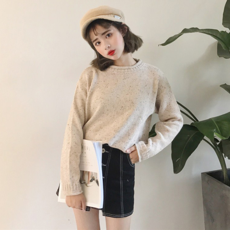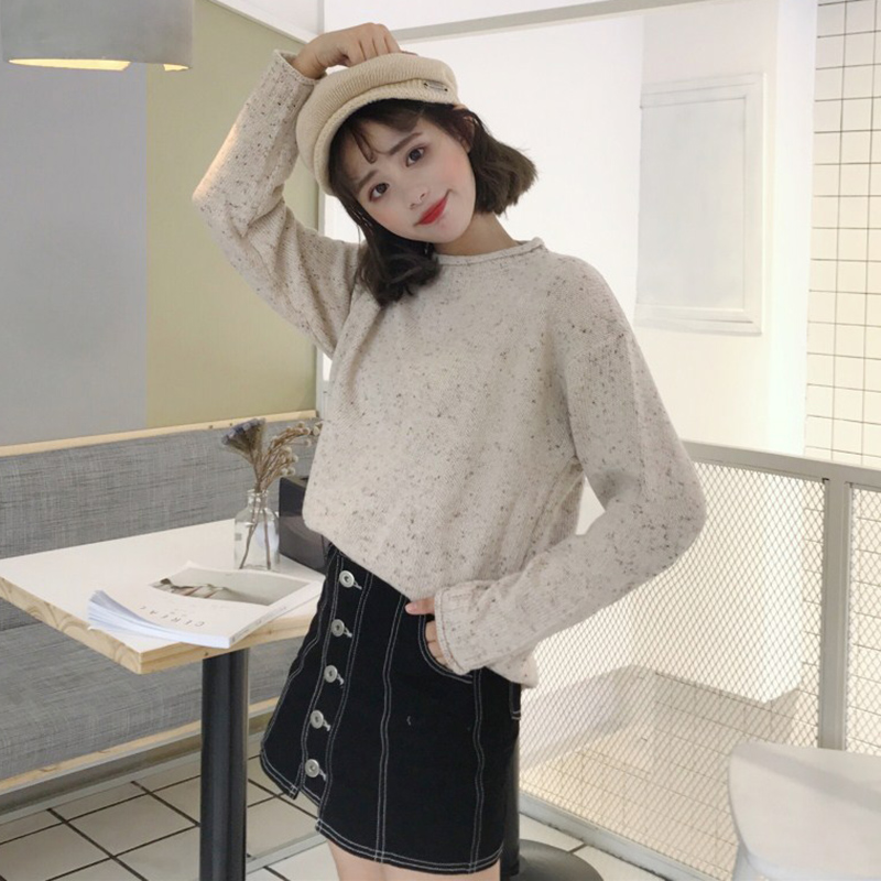 學院風簡約花點毛衣裝女秋季2018新款韓版寬松卷邊針織衫長袖上衣