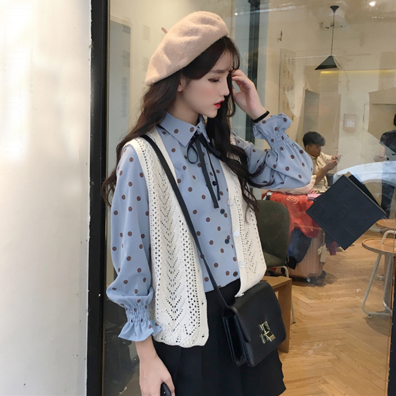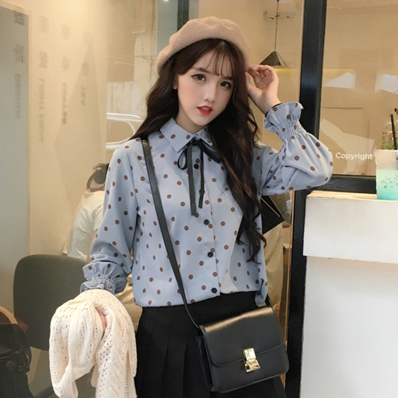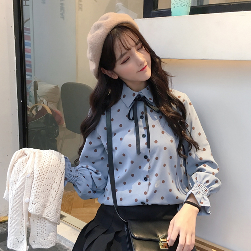 / 蝴蝶結復古波點襯衫女秋裝新款寬松荷葉長袖襯衣學生百搭休閑上衣