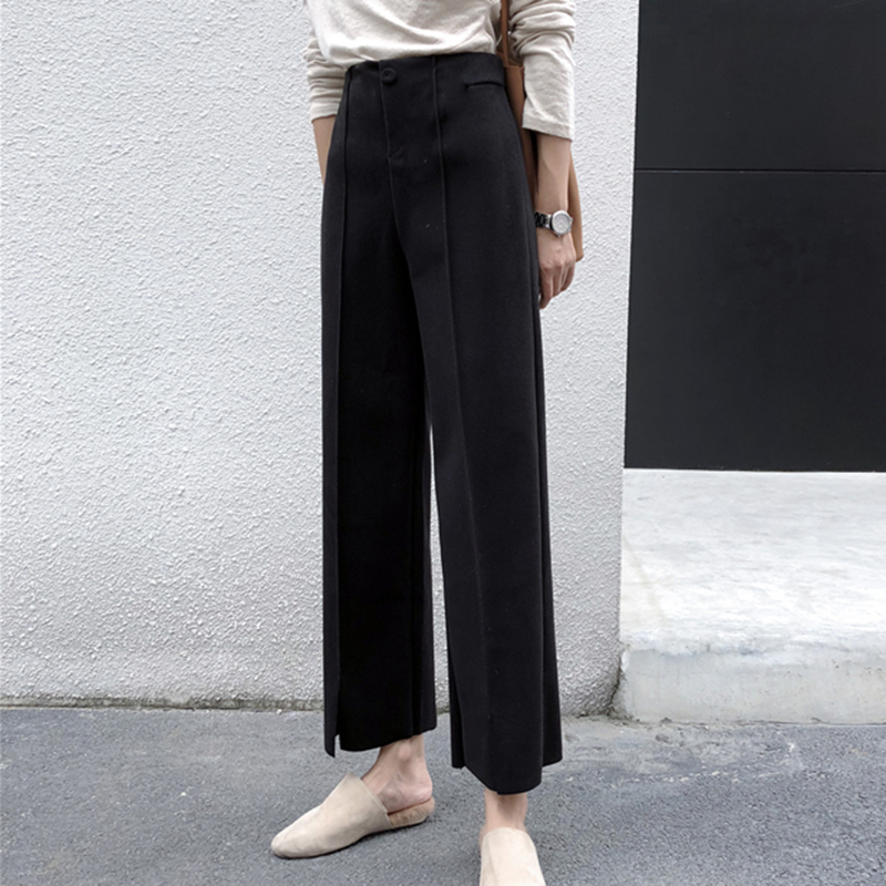 秋冬女裝2018新款復古風高腰顯瘦開叉休閑褲黑色寬松闊腿九分褲子