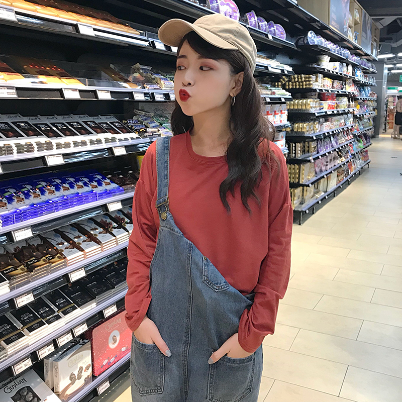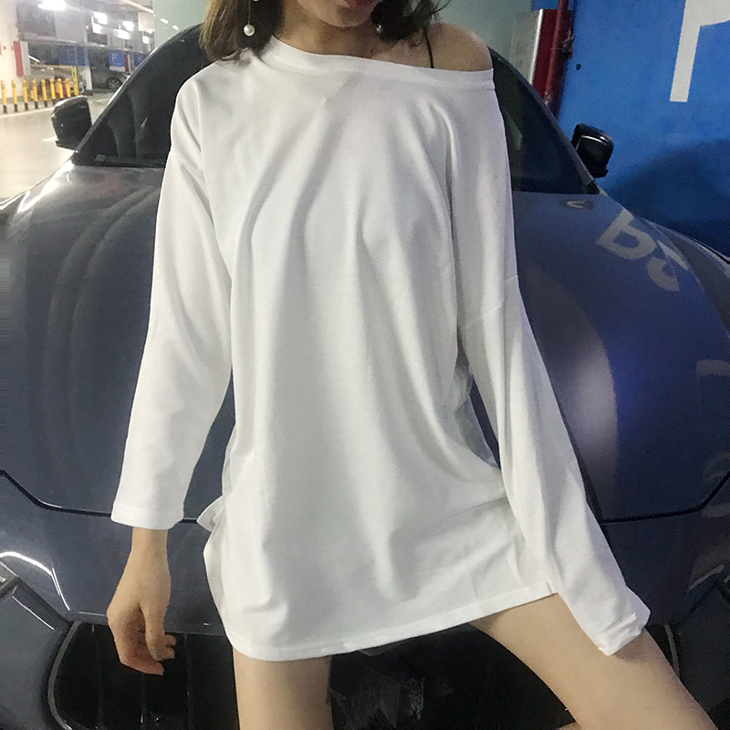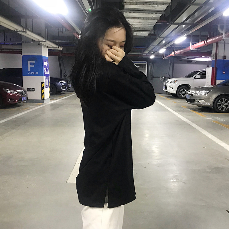 秋季新款女裝韓版寬松圓領長袖t恤上衣女寬松開叉體恤學生打底衫