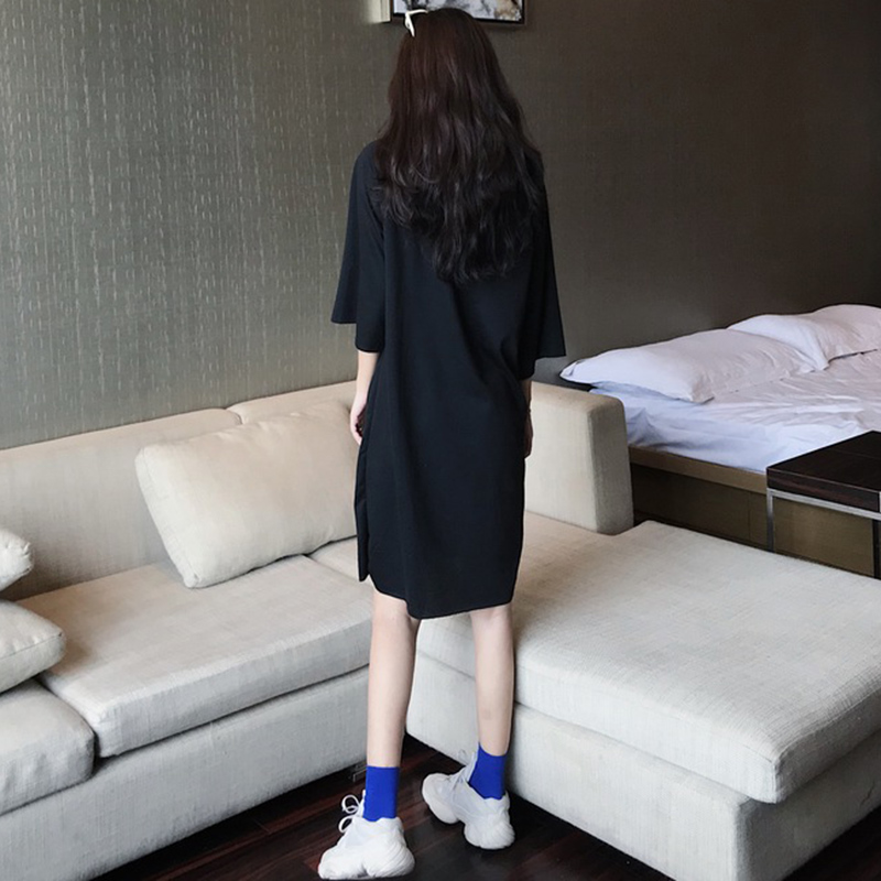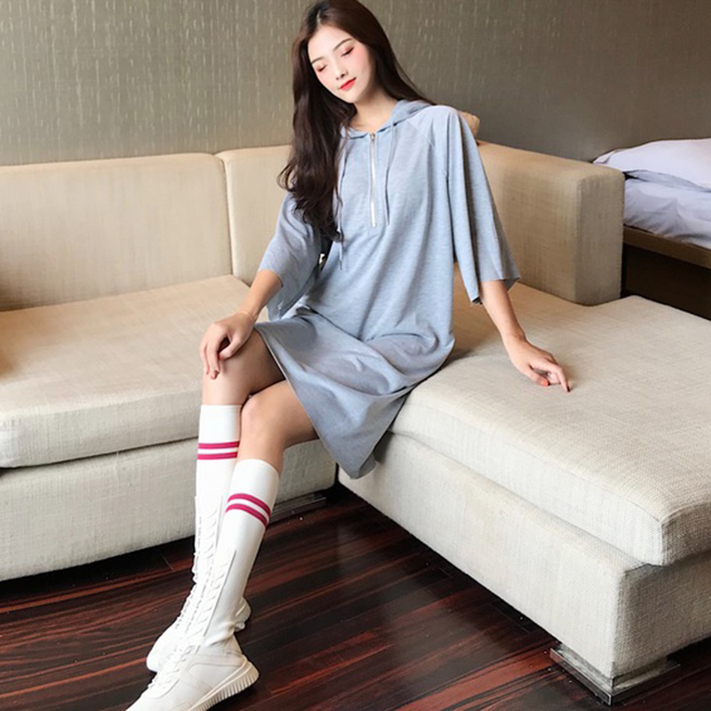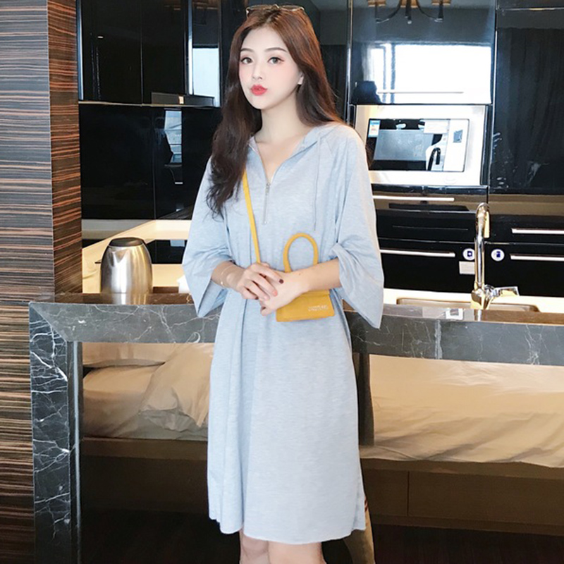 / 慵懶風連帽衛衣薄款秋裝2018新款韓版學生寬松中長款黑色連衣裙子
