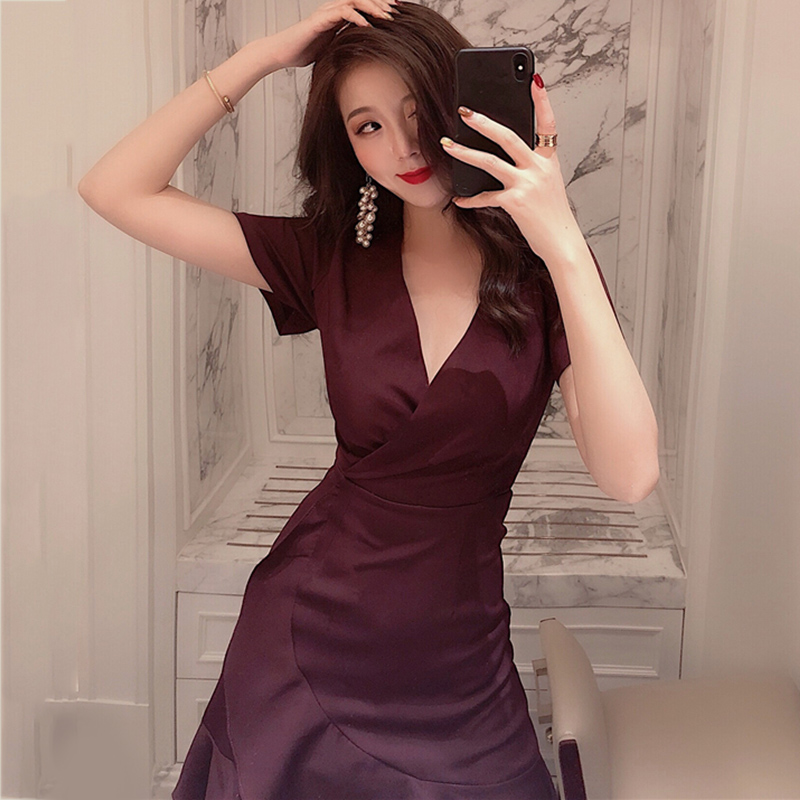 收腰顯瘦連衣裙女夏裝2018新款不規則荷葉邊V領小黑裙氣質短裙子