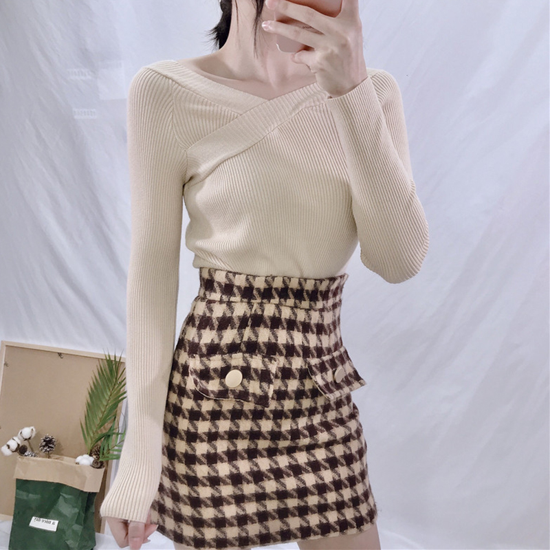 / 糖果色露肩V領針織衫秋裝女2018新款韓版修身顯瘦打底衫長袖上衣