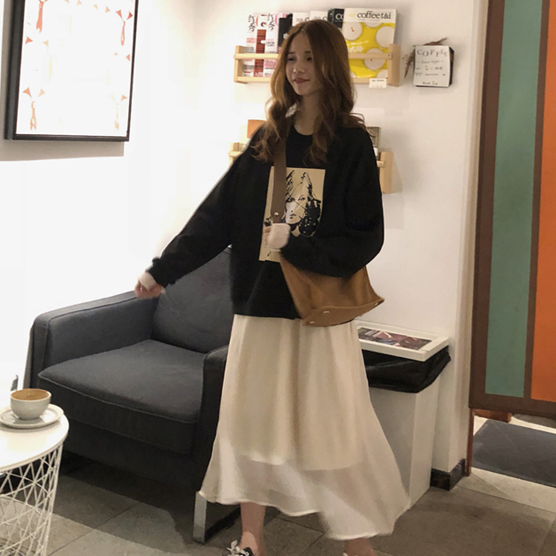 秋裝女2018新款簡約圖案長袖衛衣溫柔V領打底蕾絲邊連衣裙兩件套