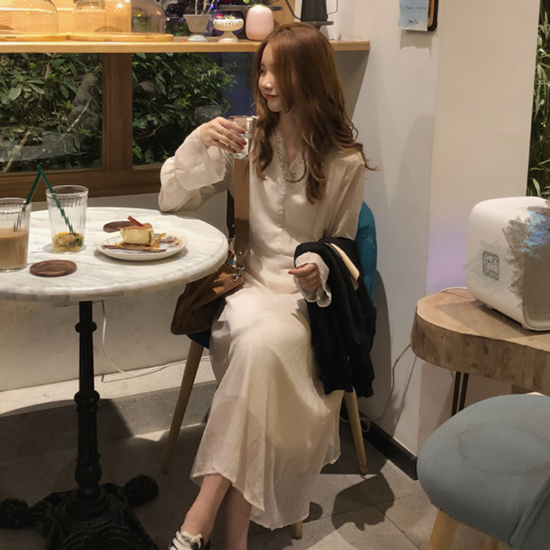 / 秋裝女2018新款簡約圖案長袖衛衣溫柔V領打底蕾絲邊連衣裙兩件套