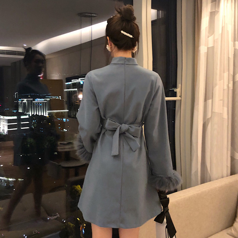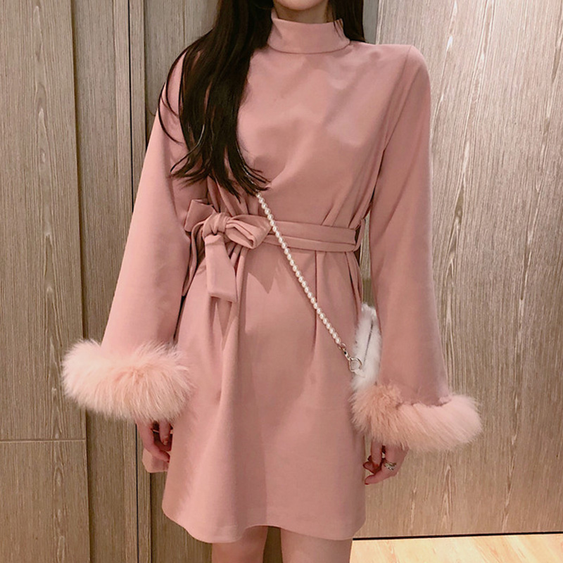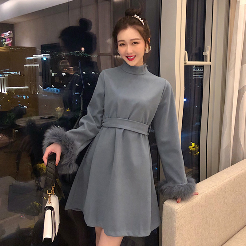 / 小高領呢子連衣裙秋裝女2018新款收腰A字短裙寬松毛毛長袖桔梗裙