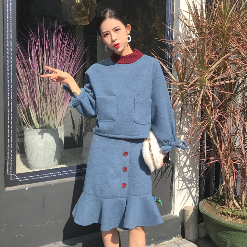 / 洋氣套裝女秋冬2018新款撞色寬松帶袖衛衣高腰單排扣魚尾半身裙子