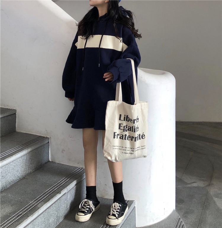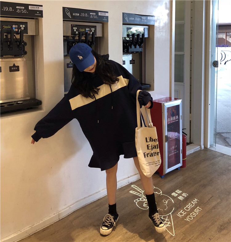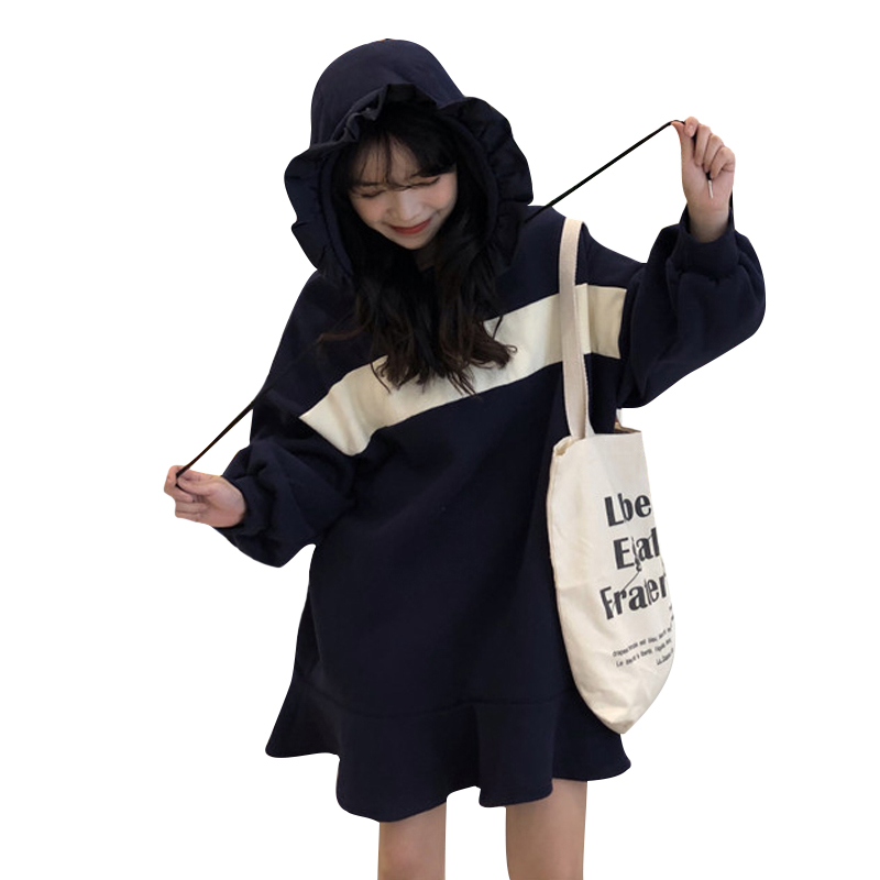 2018新款秋冬韓版中長款寬松花邊帽拼接加厚加絨衛衣連衣裙外套女