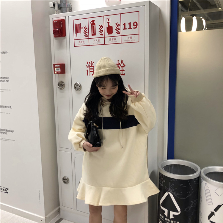 / 2018新款秋冬韓版中長款寬松花邊帽拼接加厚加絨衛衣連衣裙外套女