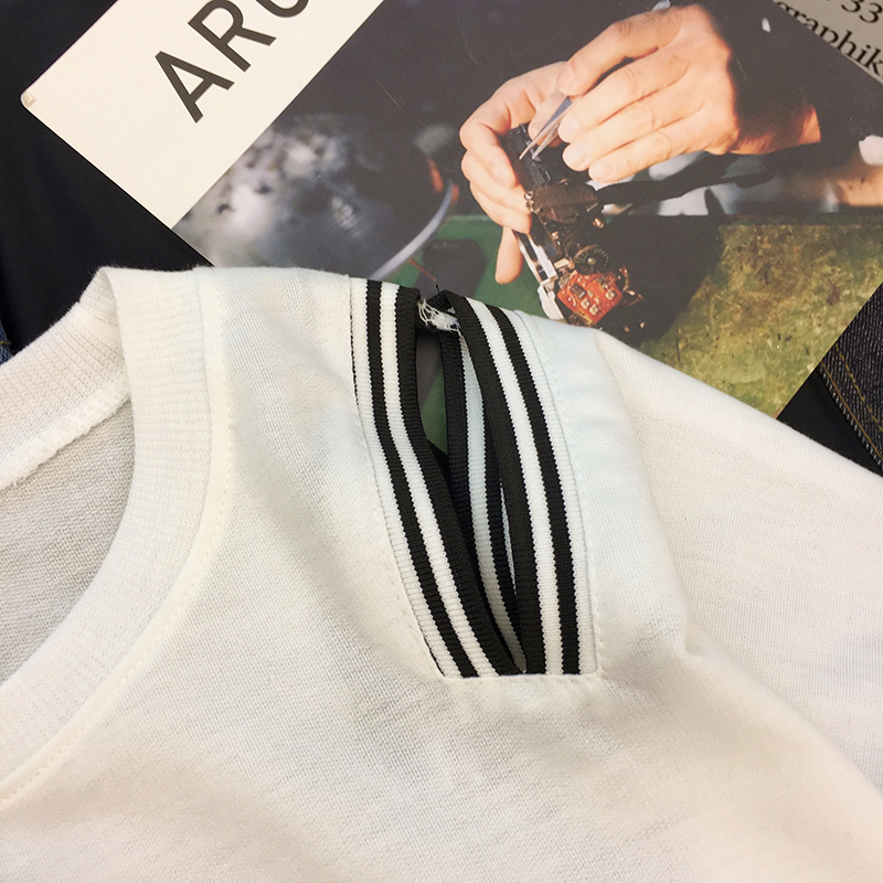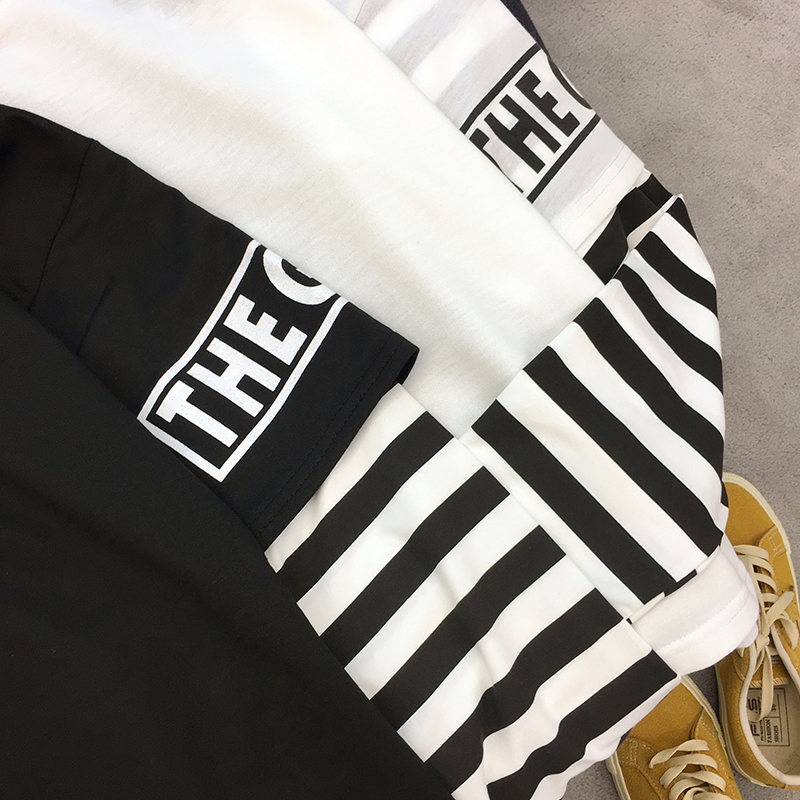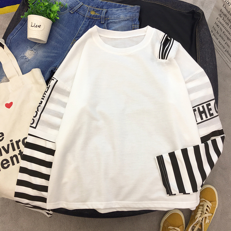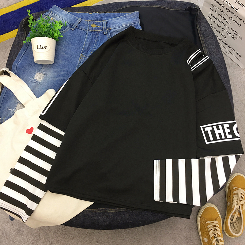 時尚條紋拼接假兩件上衣女秋裝新款字母印花長袖體恤寬松休閑T恤