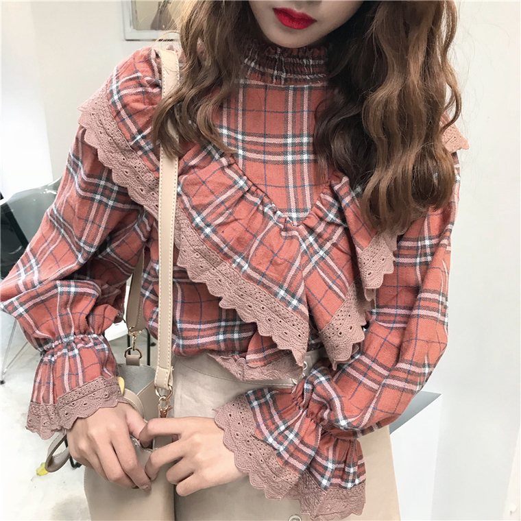 / 秋裝女2018新款復古荷葉邊立領格子襯衫學生休閑燈籠長袖寬松上衣