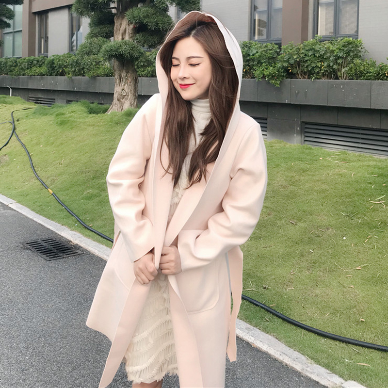 / 中長款2018流行呢子大衣女冬裝新款寬松長袖系帶收腰連帽毛呢外套