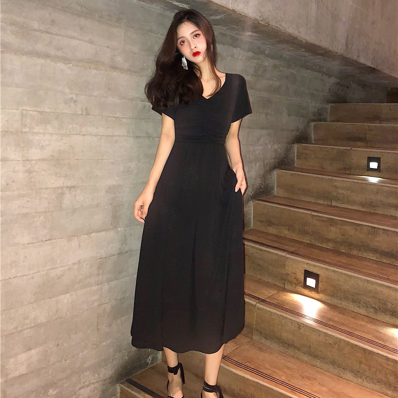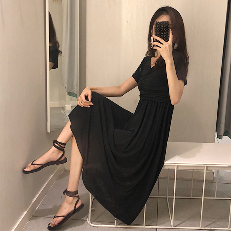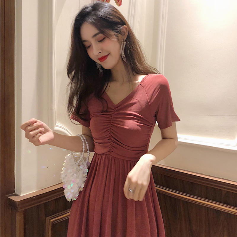 A字裙女夏新款韓版女裝修身褶皺v領大擺長款裙氣質百搭短袖連衣裙