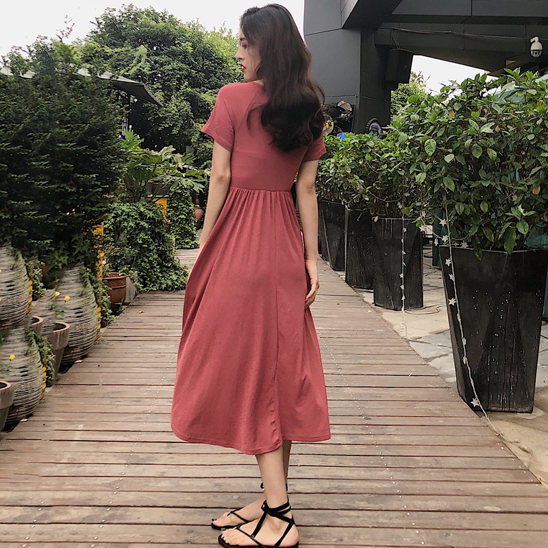 / A字裙女夏新款韓版女裝修身褶皺v領大擺長款裙氣質百搭短袖連衣裙