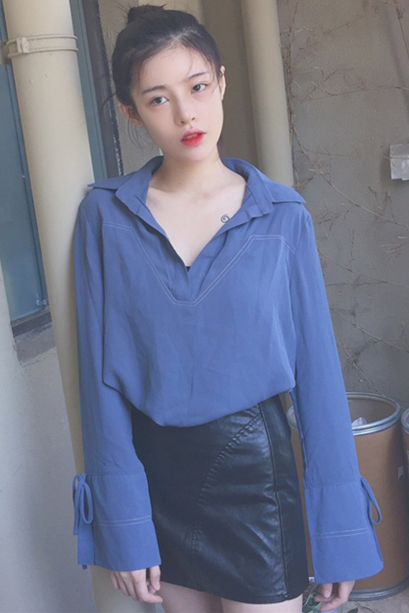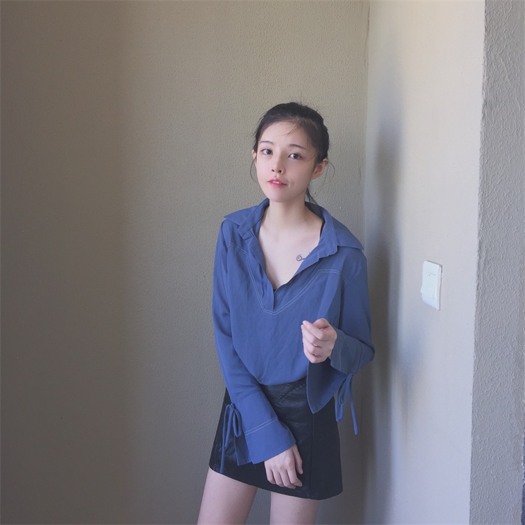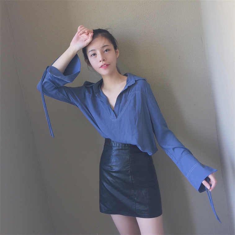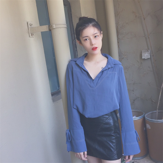 / 秋裝女2018新款chic早秋襯衫系帶喇叭袖韓范學生修身長袖襯衣女