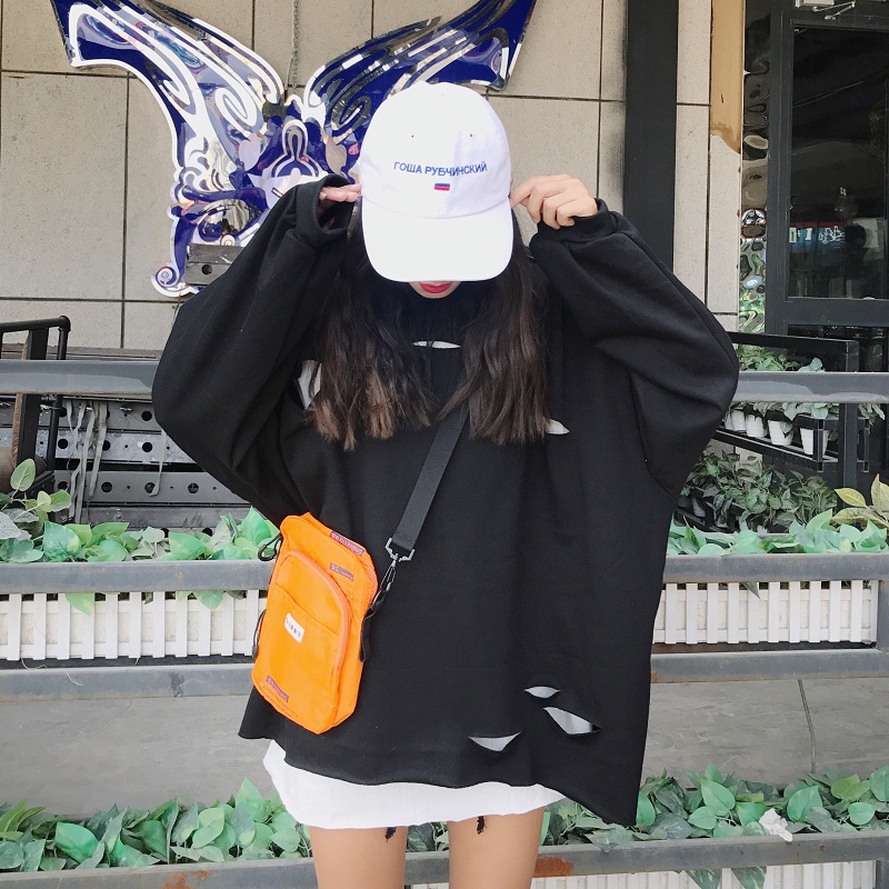 春季女裝新款韓版原宿風撞色破洞拼接假兩件上衣學生寬松休閑衛衣