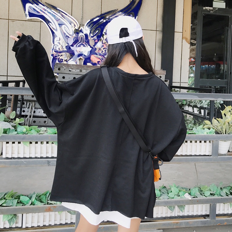 / 春季女裝新款韓版原宿風撞色破洞拼接假兩件上衣學生寬松休閑衛衣