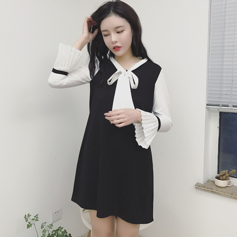 秋裝新款2018女港味假兩件少女系帶蝴蝶結黑白拼色喇叭袖連衣裙女