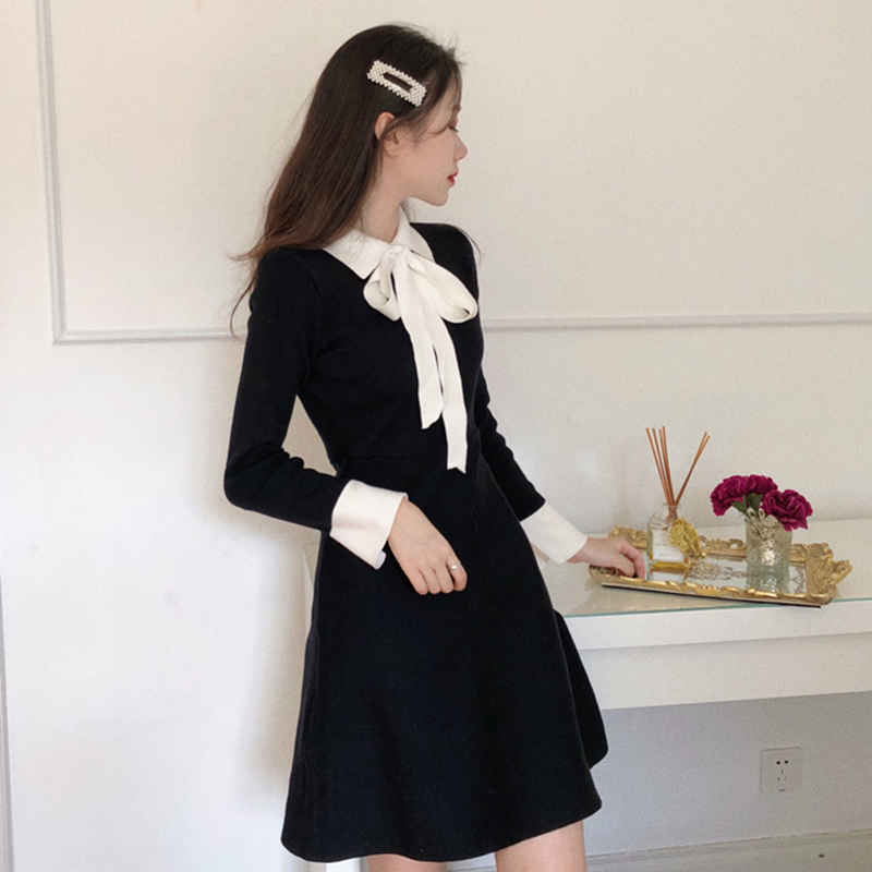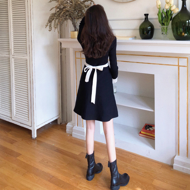中長款裙子女秋冬裝2018新款氣質顯瘦蝴蝶結綁帶A字針織連衣裙子