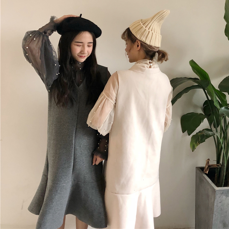 / 心機女套裝秋冬新款兩件套顯瘦長袖雪紡上衣毛呢魚尾背心連衣裙子