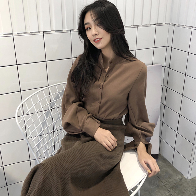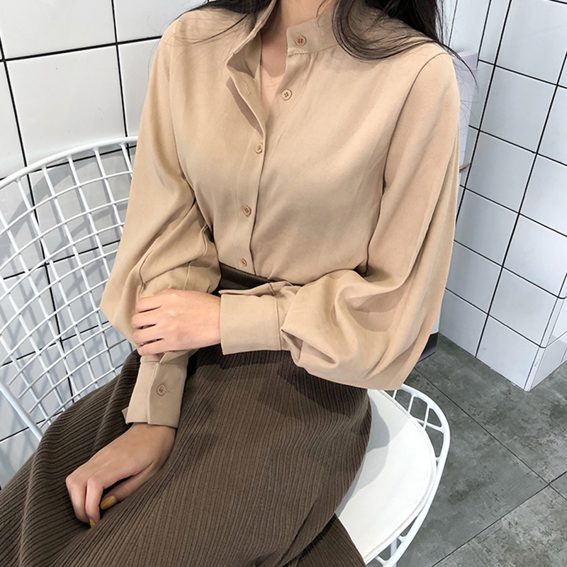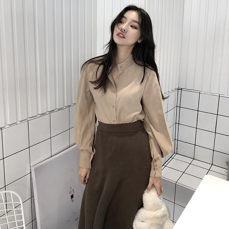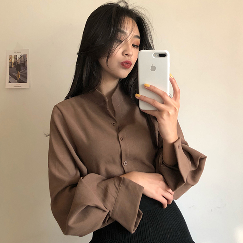 / 港味復古立領單排扣藍色襯衫女秋裝2018新款休閑寬松時尚長袖上衣