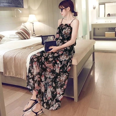 / 2018春季甜美海邊度假雪紡沙灘裙波西米亞長裙學生碎花吊帶連衣裙
