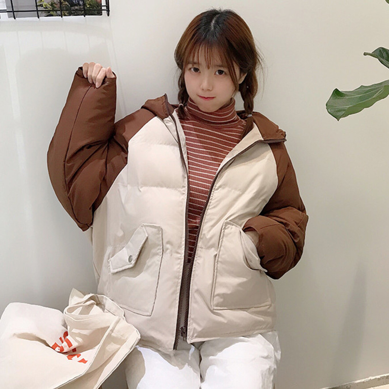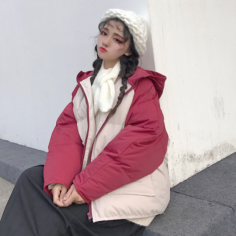 學院風拼色連帽面包服女冬裝2018新款韓版寬松加厚連帽棉衣服外套