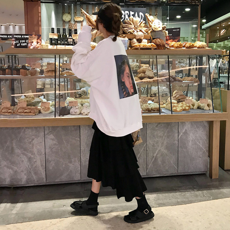 / 時尚套裝女秋新款貼布長袖衛衣寬松上衣高腰黑色蛋糕中長A字裙子