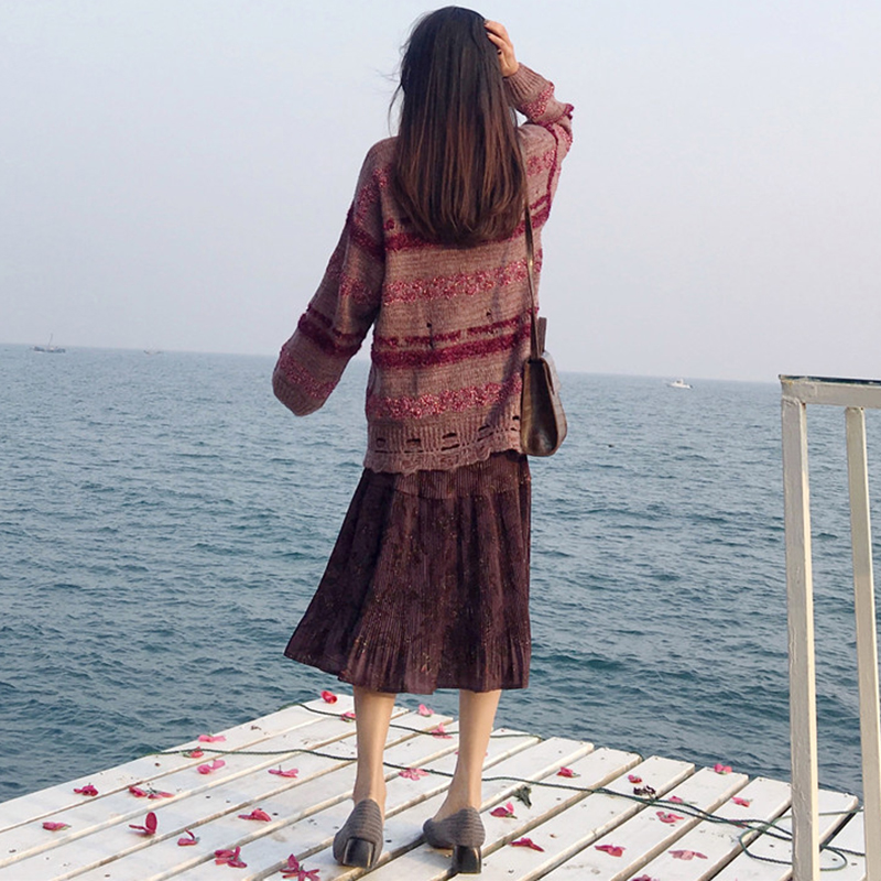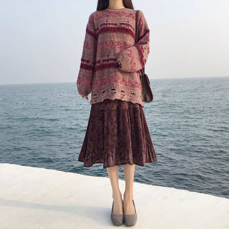 / 破洞毛衣慵懶風針織外套高腰顯瘦A字半身裙子時尚套裝女秋冬新款