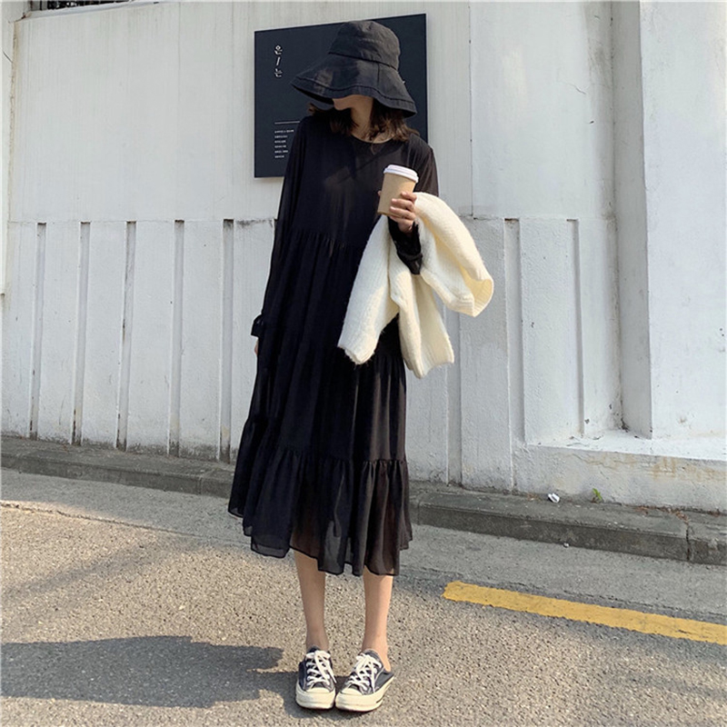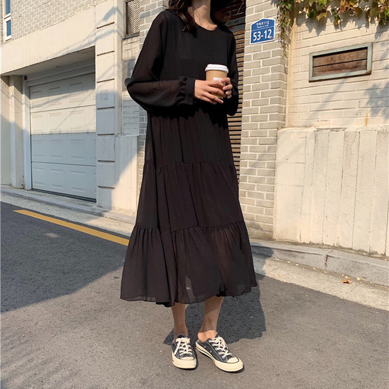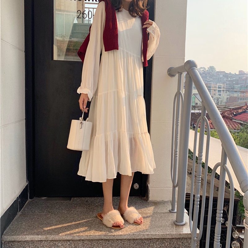 秋冬女裝2018新款韓版白色雪紡A字連衣裙寬松長袖egg風荷葉邊裙子