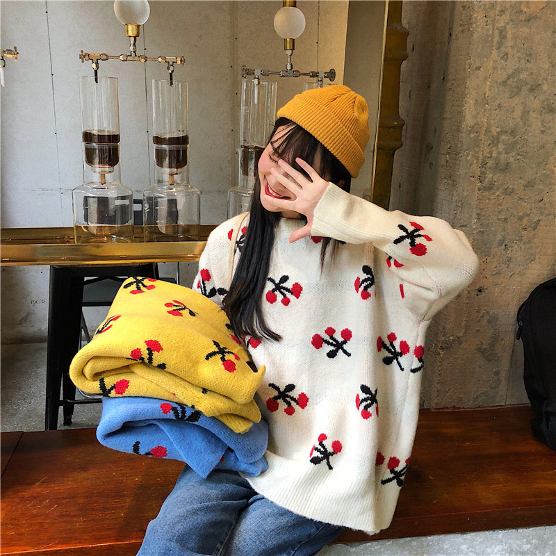 2018新款秋冬韓版寬松慵懶風小清新甜美櫻桃套頭超火針織衫毛衣女