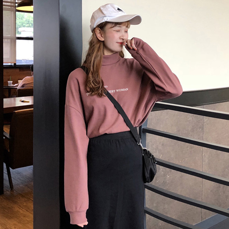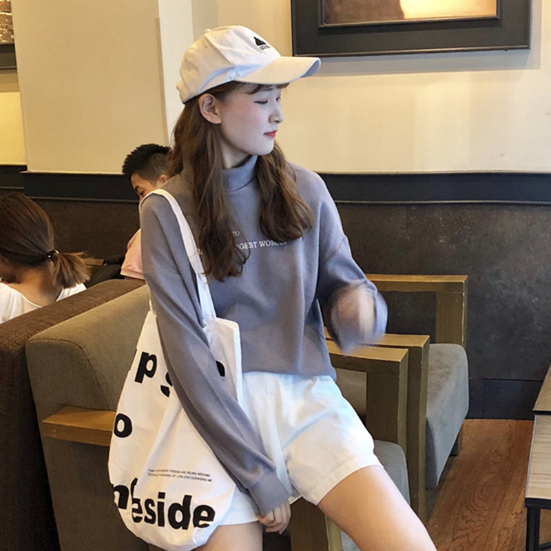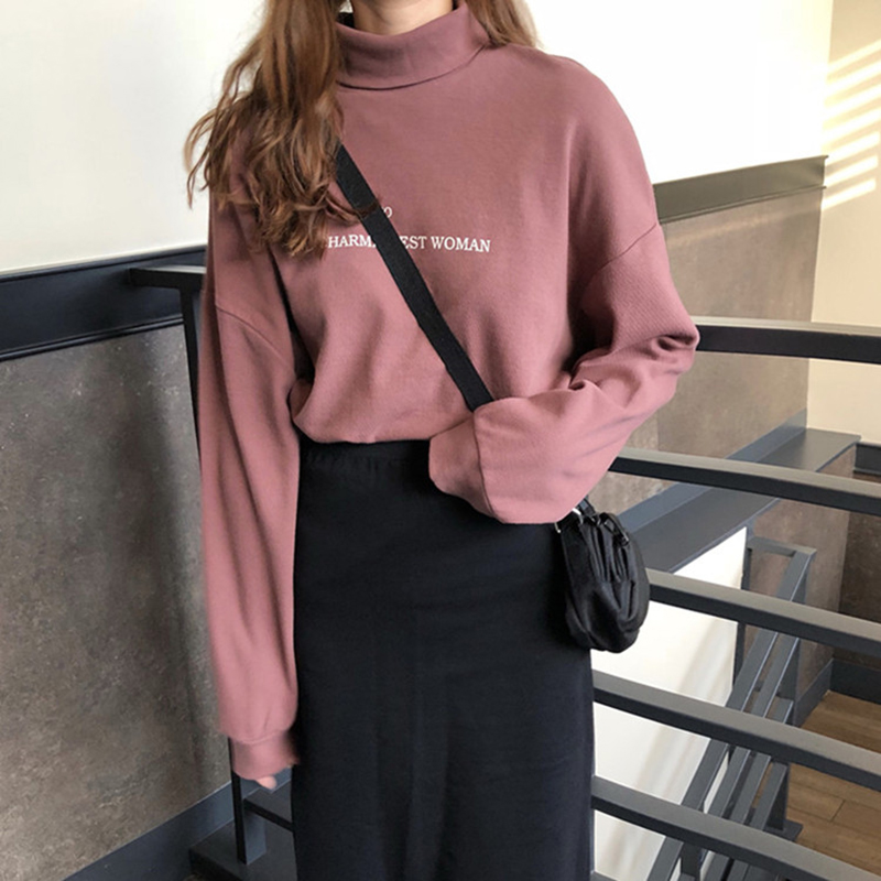 高領字母印花長袖T恤女秋冬裝2018新款學生韓版修身顯瘦打底上衣