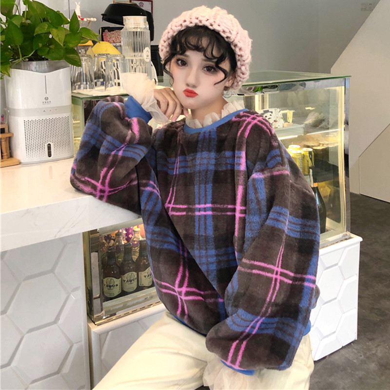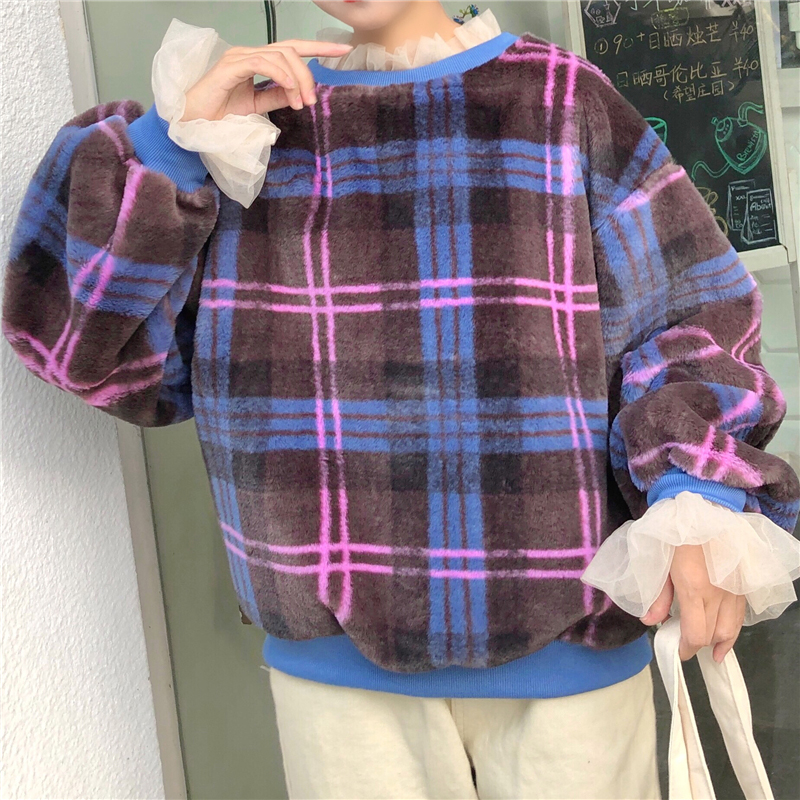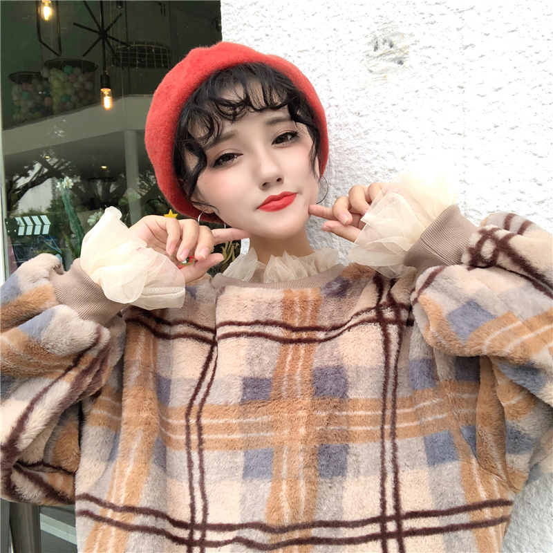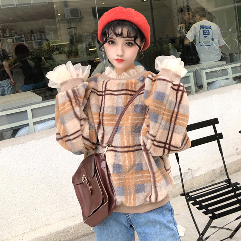 / 學生復古格子寬松衛衣秋冬女裝新款網紗拼接毛茸茸長袖外套上衣潮