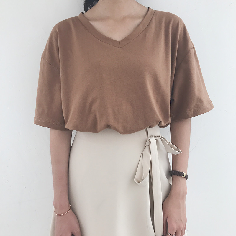 夏季新款女裝韓版chic風寬松V領純色短袖打底衫甜美百搭學生t恤女