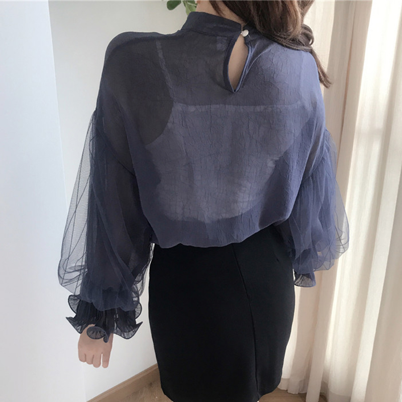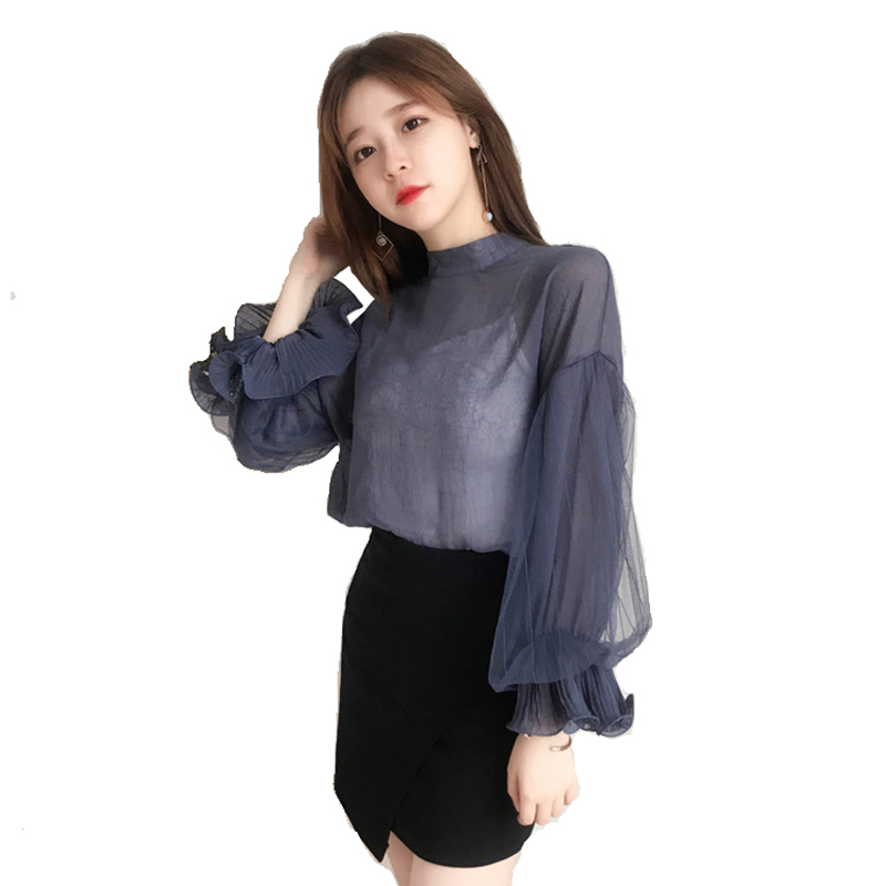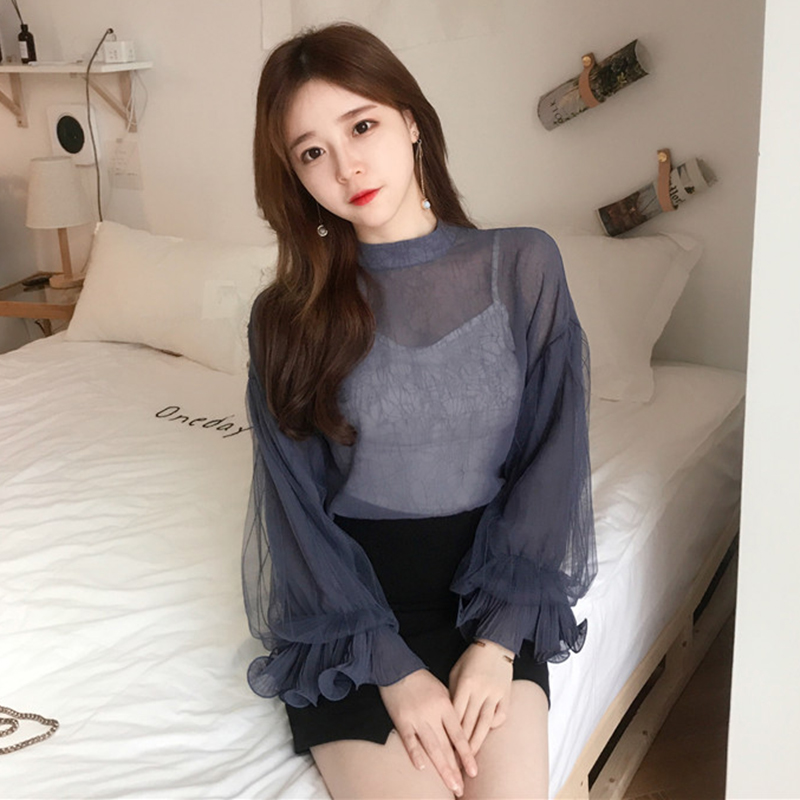 甜美兩件套裝女秋新款氣質蕾絲燈籠長袖雪紡衫修身打底吊帶短背心