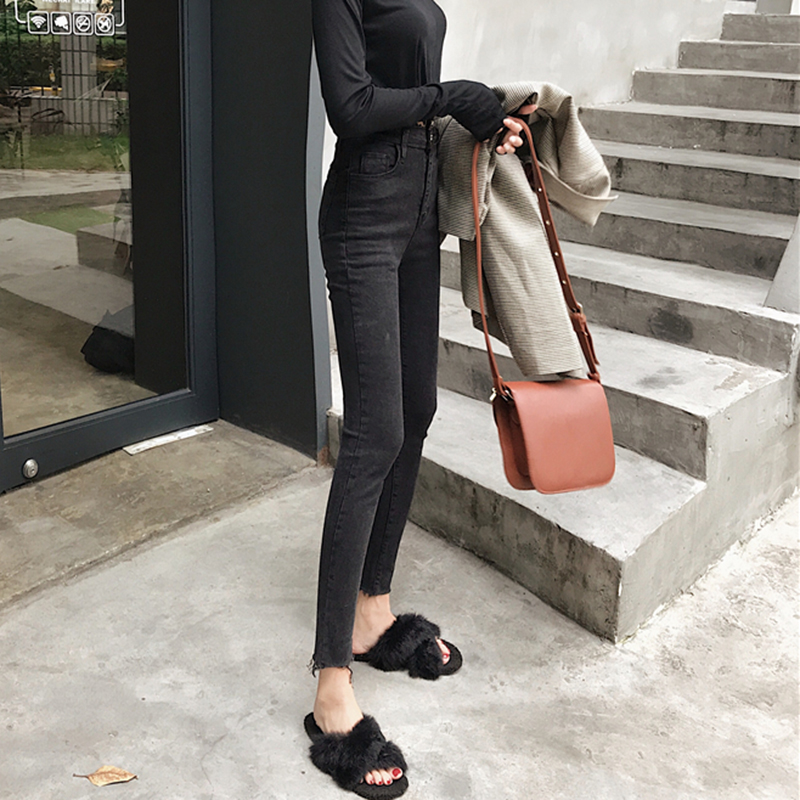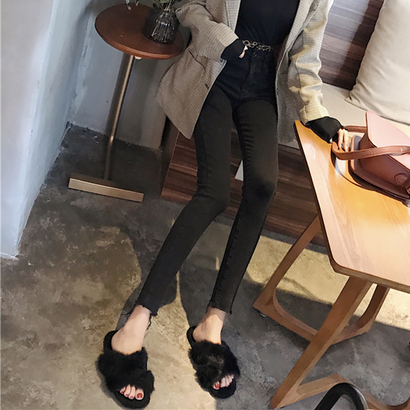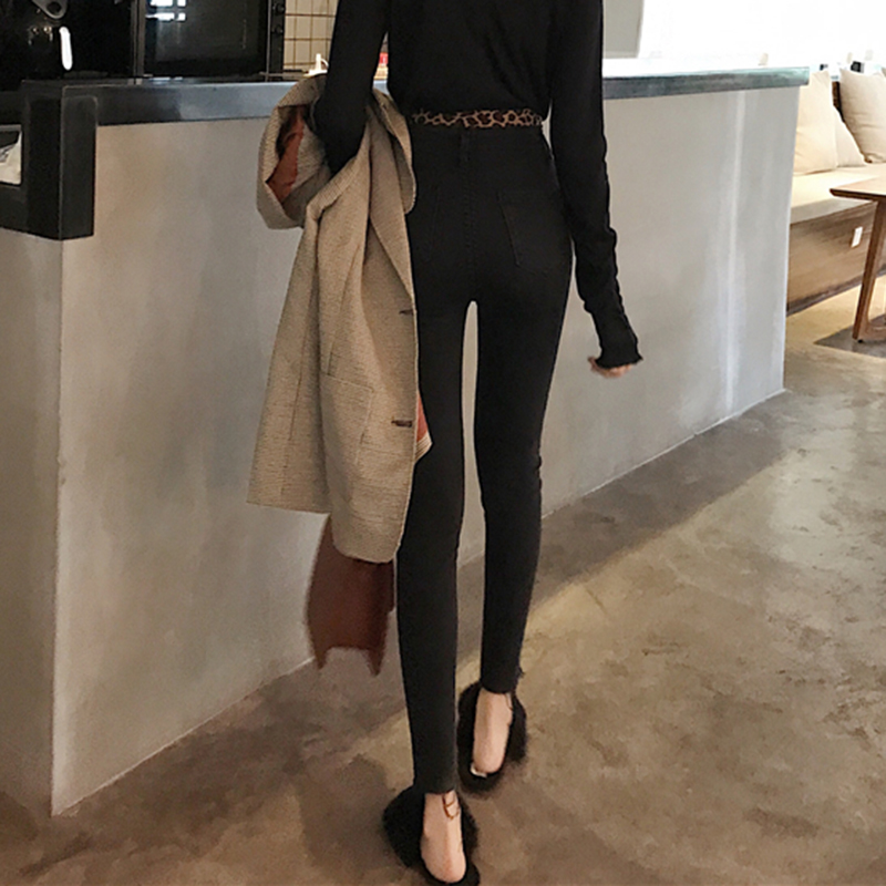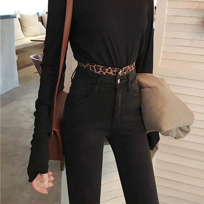 chic豹紋拼接牛仔褲女秋冬裝2018新款韓版高腰修身顯瘦小腳鉛筆褲